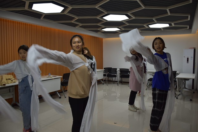 “每周五我們?cè)谖璧附淌蚁嗑郏诠诺湟魳返难障?,我們開始學(xué)習(xí)古典舞,水袖的每次揮動(dòng),都是我們對(duì)于這門課的熱愛?!泵飨0嗤蹑迷凇皹贰っ鲉枌W(xué)堂”之“古典舞體驗(yàn)課”結(jié)課后說到。舞蹈教室里,伴隨著古樂聲,書生們身著紗質(zhì)舞衣,袖若流水清泓,回眸淺笑,傾身起舞。朋輩導(dǎo)師、明德書院2018級(jí)學(xué)生黃思旅教給大家的中國古典舞極富韻律感,獨(dú)有的東方式剛?cè)岵?jì)的美感,令人陶醉。明德書院六藝學(xué)堂開展的古典舞體驗(yàn)課,共8課時(shí)。此課程讓學(xué)生了解了中國舞蹈的魅力,體驗(yàn)了中國舞蹈的韻味,以大美之藝傳中華文化。