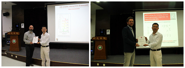 編輯:邵澤 審核:馬壯 閱讀次數:在國家外專局短期引智項目的支持下,受材料學院結構可控先進功能材料與綠色應用北京重點實驗室主任張加濤教授、李紅博教授邀請,國際半導體納米晶/量子點研究專家米蘭比科卡大學Sergio Brovelli教授和比利時根特大學Iwan Moreels 教授于9月22日至28日訪問北理工。9月26日上午,在中關村校區研究生樓101報告廳分別作了題為“Colloidal synthesis of fluorescent 2D nanocrystals across the visible and near-infrared range”和“Advances in electronic doping of solution-grown semiconductor nanocrystals towards cutting-edge application”的“百家大講堂”學術報告。張加濤教授代表北理工向兩位教授頒發了北理工“百家大講堂”紀念證書。材料學院鐘海政教授、陳棋教授,上海交通大學李良教授,澳大利亞科庭大學夾國華教授,以及材料學院、化學學院其他青年教師和學生聆聽了此次報告。