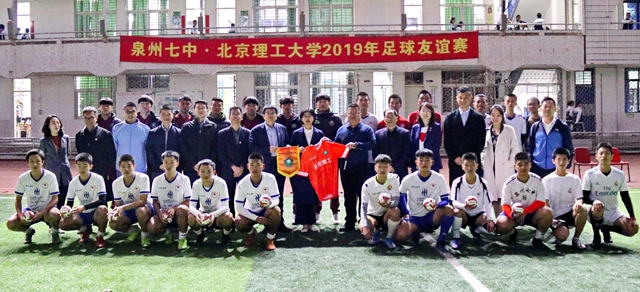 在足球場,王兆華向莊月芳贈送了北理工足球隊隊旗和球員簽名球衣,北理工足球隊與泉州七中足球隊小將進行了一場“以球會友”的交流活動。北理工足球隊的大哥哥們還為七中的小球員送上簽名足球,球場上歡聲笑語一片。北理工在校學生家長代表,已簽約北理自主招生的七中學生參加了此次活動。