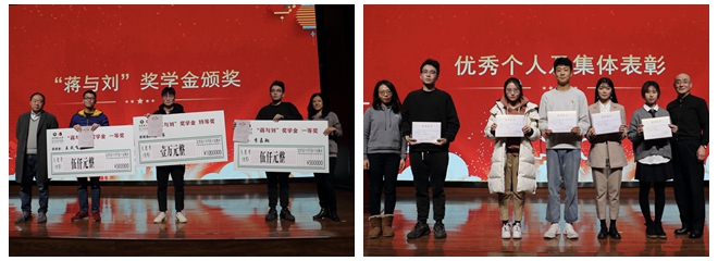 楊新、姬勇、程九軍、李笑寒、張祖群分別為獲得“蔣與劉”獎(jiǎng)學(xué)金的和優(yōu)秀表彰的同學(xué)和集體頒獎(jiǎng),并合影留念。