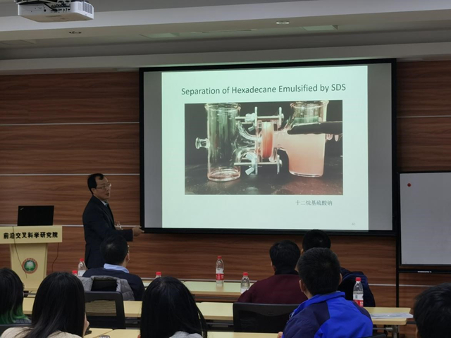 Guojun Liu教授首先介紹了防油和防水的超雙疏涂料的制備。目前,超雙疏涂料的制備通常涉及使用全氟化合物,但是現在許多國家都禁止使用全氟化合物,并且其涂層還缺乏耐磨性和光學清晰度,然而Guojun Liu教授課題組研發的一種超雙疏NP-GLIDE透明涂料是在其基質中包含有納米尺寸的超雙疏區域,并且使用更加便宜環保的聚二甲基硅氧烷作為原料,其硬度可超過9H,耐鋼棉磨損,同時具有透明性和柔韌性。Guojun Liu教授還介紹了通過簡單過濾的方法分離乳化油和乙醇。傳統的過濾分離方法很難將與水混溶的溶劑(例如乙醇)與水進行分離。然而Guojun Liu教授課題組通過Janus過濾膜的方法,實現乳化油與水的高通量分離。該過濾膜可以使乳化的油滴聚集,然后選擇性地從水中分離出聚集的油相。基于同一原理,該濾膜可以通過過濾的方法從水中高效地分離乙醇。報告結束后,Luis M. Liz-Marzán教授與在場的師生進行了深入的討論和熱烈的交流。