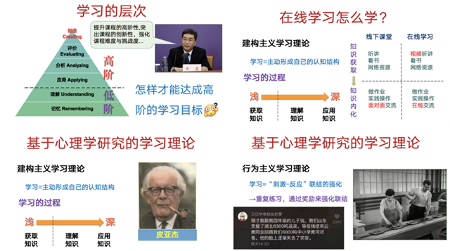 高琪首先發(fā)起了居家學(xué)習(xí)狀態(tài)小調(diào)查,由此引發(fā)同學(xué)們的思考:線上學(xué)習(xí)和課堂學(xué)習(xí)兩種學(xué)習(xí)方式有何不同?學(xué)習(xí)效率受哪些因素影響?為使同學(xué)們科學(xué)全面地認(rèn)識(shí)學(xué)習(xí)的本質(zhì),他從學(xué)習(xí)的定義和層次談起,強(qiáng)調(diào)提升學(xué)習(xí)的高階性才得取得良好的效果。隨后,他進(jìn)一步強(qiáng)調(diào),找到科學(xué)的學(xué)習(xí)模式有助于達(dá)成高階的學(xué)習(xí)目標(biāo)。他由古哲學(xué)家對(duì)學(xué)習(xí)的經(jīng)驗(yàn)總結(jié)引入,概述了行為主義學(xué)習(xí)理論和建構(gòu)主義學(xué)習(xí)理論,并對(duì)兩種理論進(jìn)行比較,借助生動(dòng)的案例深入淺出地為大家剖析了學(xué)習(xí)的全過程,提出了虛假學(xué)習(xí)和真實(shí)學(xué)習(xí)的概念,提醒同學(xué)們警惕“假努力”陷阱。