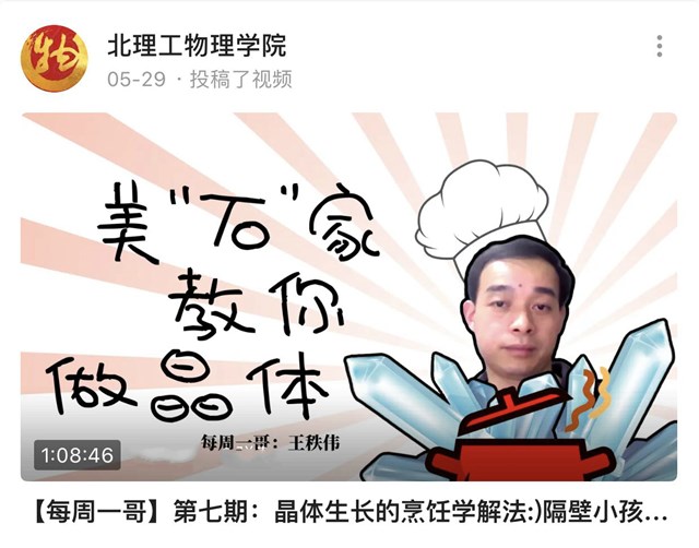 “響應號召,排一個?!蔽锢韺W院教師群里時不時會蹦出這樣一條消息,這是學院專業教師報名“每周一哥”欄目的場景。雖然手頭還有課題要忙,實驗安排也是滿滿當當,但這絲毫沒有削減物理學院專業教師們參與科普工作的熱情。在直播中,他們化身科普“主播”,量子力學、納米剪紙、等離子體等物理學前沿內容呈現在觀眾面前,老師們詼諧幽默的講解搭配著精心準備的PPT,再加上饒有趣味的后期剪輯風格,寓教于樂,使得欄目深受觀眾喜愛。一些領航中學還將“每周一哥”系列科普視頻作為學?!暗诙n堂”“雙創教育”的學習課程面向學生播放?;顒釉诎l揮科普作用的同時,也提高了學校知名度和物理學科美譽度。
