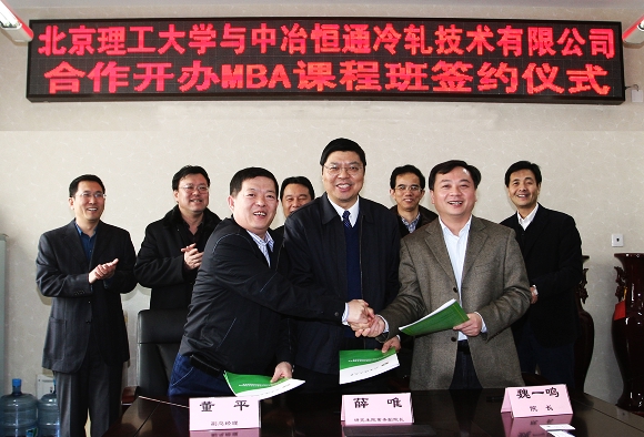 2009年3月4日,我校與中冶恒通冷軋技術有限公司在我校舉行了合作開辦MBA課程進修班簽字儀式。中冶恒通冷軋技術有限公司韓繼征董事長兼總經理、董平副總經理,我校副校長、研究生院院長孫逢春教授、研究生院薛唯常務副院長、管理與經濟學院魏一鳴院長及相關部門負責人出席了儀式,儀式由管理與經濟學院李金林書記主持。董平副總經理、薛唯教授和魏一鳴教授分別代表中冶恒通公司、研究生院和管理學院分別在合作協議書上簽字。