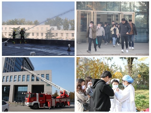 演習分三個階段。第一階段上午10:30,10號新信息樓4層409房間因為電氣原因產生明火和大量煙霧。同時三名學生被困4層平臺。物業人員發現后,使用滅火器進行了前期撲救。第二階段,學校義務消防隊得到報警后,趕到現場使用室內外消火栓進行撲救,并將樓內人員疏散至樓北側小花園。第三階段由雙榆樹消防中隊趕到現場,通過云梯車將被困人員解救,并由校醫院醫生進行緊急救治。最終使用消防車水炮和室內消火栓將明火撲滅,排煙車將樓內煙霧排出。