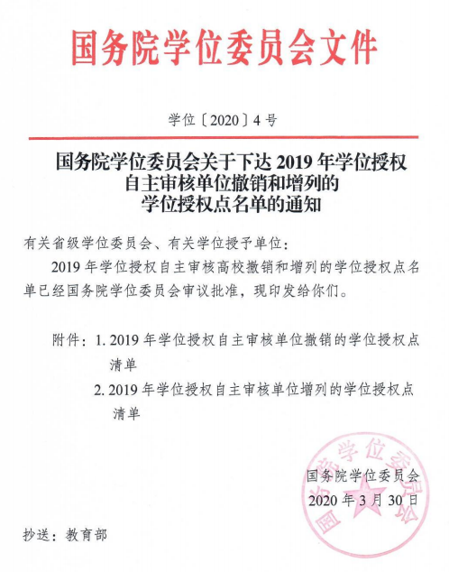 3月31日,國務院學位委員會公布了2019年學位授權自主審核單位增列授權點名單,我校馬克思主義理論獲批增列一級學科博士學位授權點。