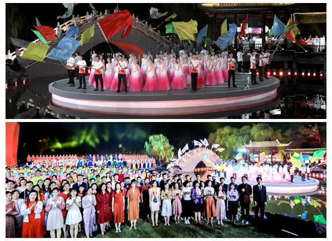 在絢爛多彩的屏幕緩緩降下時,尾聲“創未來”從遠處棧橋上北理工交響樂團的演奏中徐徐展開,環北湖燈光亮起,各學院、書院代表英姿颯爽手舉院旗向觀眾席走來,八面北京理工大學校旗在眾人簇擁下,飄揚在絢麗的舞臺上。北湖畔的樹林中、山坡上、拱橋邊、廊亭下,數千名北理工師生佇立其間共唱校歌,將晚會推向高潮。在全體演職人員嘹亮的《歌唱祖國》聲中,晚會圓滿結束。