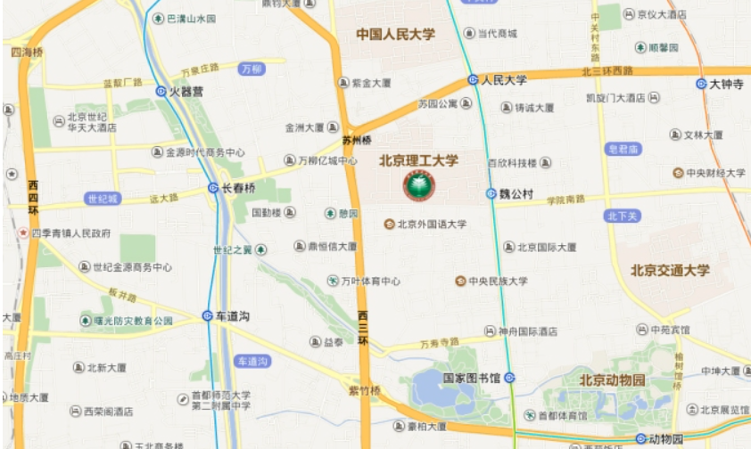 北京理工大學中關村校區位于北京市海淀區中關村南大街5號,占地面積1063畝,四面環路,東鄰中關村南大街,南接魏公村路,西毗蘇州橋街,北跨北三環路,與友誼賓館接壤,處在北京海淀區文化城、中關村科學城和北京新技術開發試驗區和中關村國家自主創新示范區中心地段。