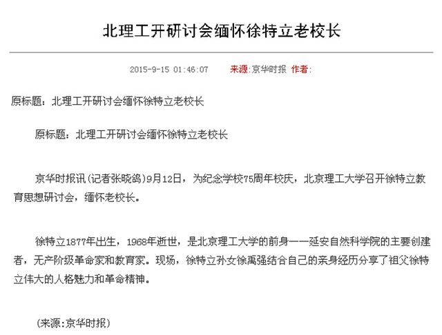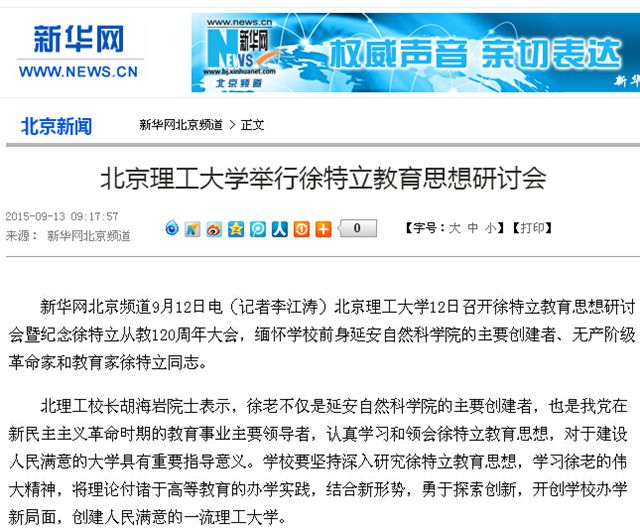 京華時報訊(記者張曉鴿)9月12日,為紀念學校75周年校慶,北京理工大學召開徐特立教育思想研討會,緬懷老校長。