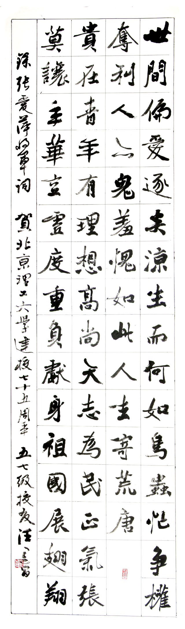 汪運昌先生,號賞古齋,中國書法家協會會員,1962年從北京理工大學畢業后,從事軍事科研工作,同時酷愛書法藝術。回憶起大學時代,汪老先生感嘆道,那時候條件艱苦,從河北的一個普通農村家庭考到北京理工大學,是當地新中國第一代大學生,完全靠著國家提供的助學金,讀完五年大學,沒有再向家里要過錢。汪老先生在校學習勤奮,善于動腦,學習成績非常優秀。講述業余時間文藝活動時,汪老先生臉上揚起了燦爛的笑容,當時他參加了學校的民樂隊,當時北理工民樂隊表演水平非常高,在北京高校中數一數二。他興奮而又謙遜地說他在里面也就是“濫竽充數”。正是在母校豐富的業余文藝氛圍熏陶下,汪老先生的藝術素養得到提升,也為以后從事書法藝術創作奠定基礎。